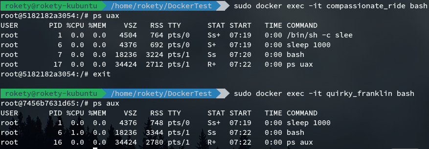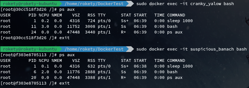 f303e8705113 yangxikun/docker-test:exec "sleep 1000" 17 seconds ago Up 15 seconds suspicious_banach