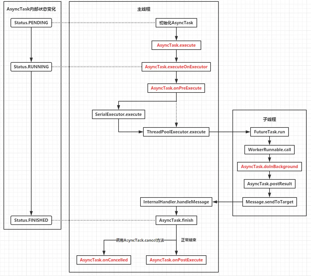 任务执行完毕后,按套路使用Handler发送Message通知主线程耗时任务已经完成了(或调用publishProgress方法一样可以让Handler发送消息通知主线程执行更新进度的操作),之后的事件就是根据发送Message的内容决定是执行onPostExecute(若设置了任务取消则执行onCancelled)还是onProgressUpdate方法了(上图由于位置有限无法体现更新进度这一过程,原理实际上是一样的)