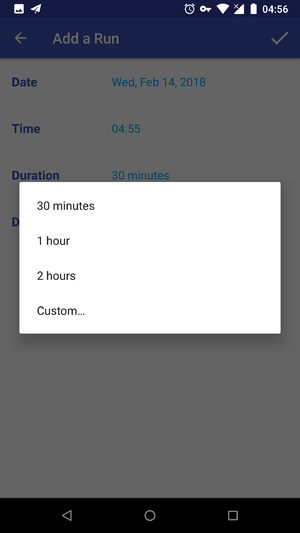 时长显示在一个 TextView 中,默认情况下显示 30 分钟。用户点击 DurationView 后会打开一个单选列表的 AlertDialog,有四个时长选项可供选择,分别为 30 分钟、一个小时,两个小时,以及自定义。