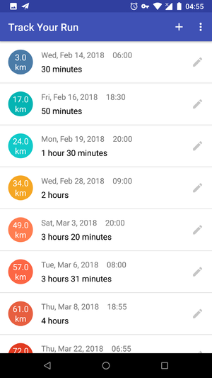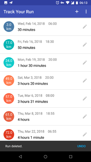 Track Your Run App 是一个通过 SQLiteDatabase 记录跑步数据的应用,重点在于 SQLite 数据库的 CRUD 操作:用户可以输入每次跑步的日期、时间、时长、距离及其单位 (Create),应用会将每条记录显示在列表中 (Read);用户可以点击每条记录进行编辑 (Update),或者左滑删除一条记录 (Delete),来管理跑步数据列表。