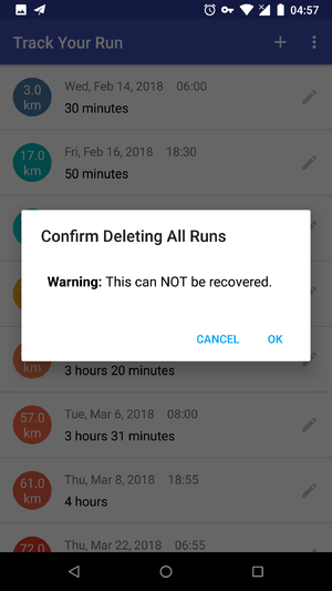 Track Your Run App 提供了两种删除 SQLite 数据库的数据的方法,第一种方法是点击 CatalogActivity 的 AppBar 的溢出菜单中的 "Delete All Runs" 选项,应用会弹出一个 AlertDialog,警告用户此操作无法恢复,用户点击 OK 后即删除数据库中的所有数据。