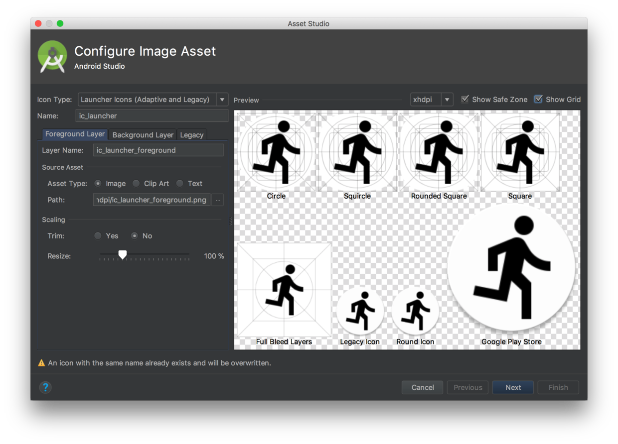 从 Android 8.0 (API Level 26) 以来,Android 引入了 Adaptive Icons 应用启动图标。它能够根据不同设备显示不同的形状,同时提供触摸反馈等动画效果。在 Android Studio 中能够通过 Image Asset Studio 很轻松地实现 Adaptive Icons,主要工作是设置前景图片,背景图片或颜色,调整不同 API 情况下生成的图标,完成后 Android Studio 就会自动生成所需的文件,完成 Adaptive Icons。