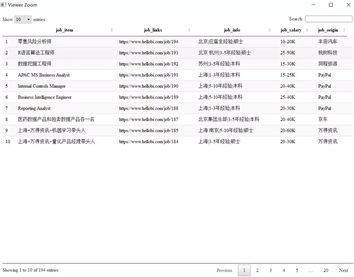 myreslut <- data.frame(job_item,job_links,job_info,job_salary,job_origin,stringsAsFactors = FALSE)