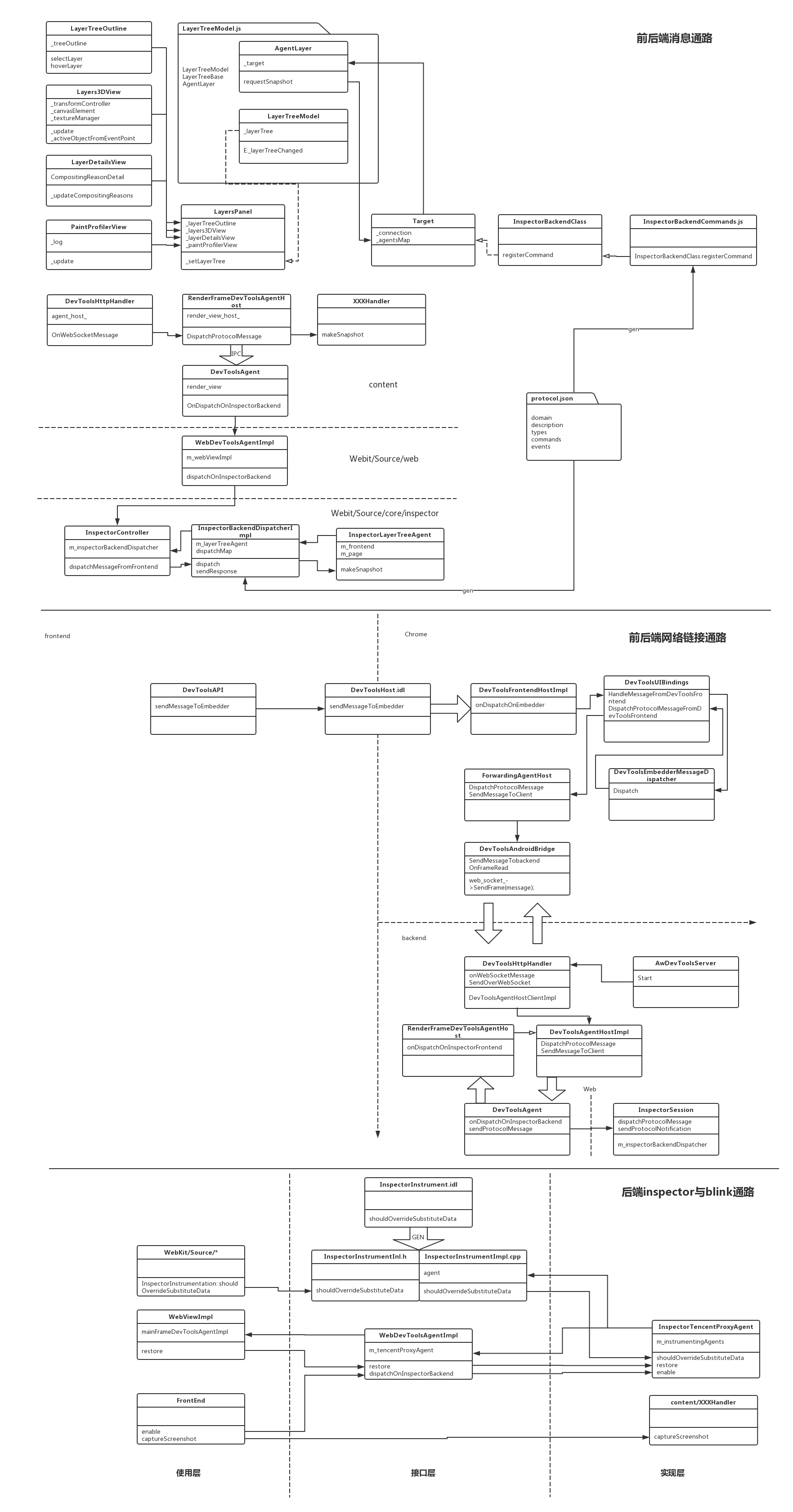 DevToolsClient下面管着blink::WebDevToolsFrontend。DevToolsClient代表content层的devtools部分和blink层对接的最底层的类,而WebDevToolsFrontend就是blink层和content层最上层的类了。这两个货到底有啥用呢?这就涉及到devtools是如何工作的了。