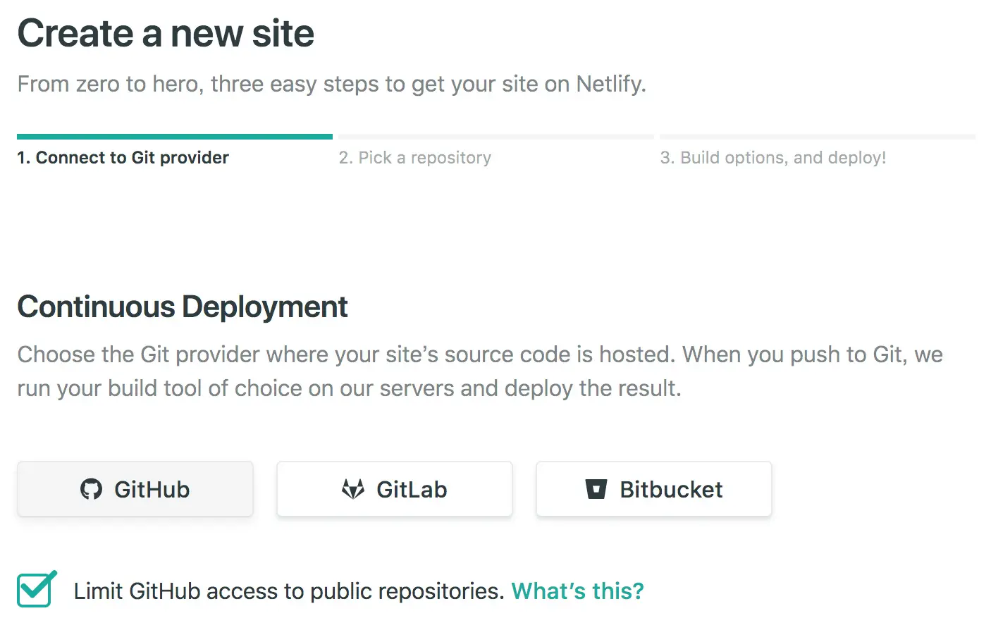 这里选择的 GitHub ,别忘记勾选访问公共仓库选项.之后授权给 Netlify 指定Repository,然后 Deploy