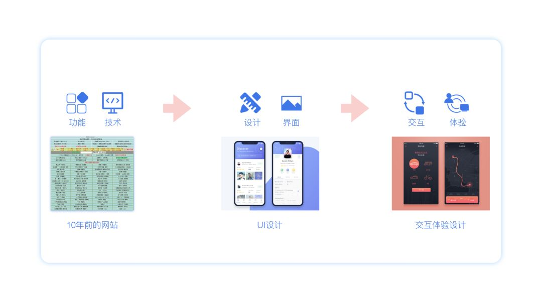 举个例子:十年前,网站盛行,技术当道。那时候对于用户来说更关注的是功能,网站使用过程中体验的更多的是有没有这个功能,能不能使用等。当网站发展到一定程度后,人们的焦点从功能转移到外观,这时候出现了大量的UI设计师。到最后人们的焦点又从外观转移到体验的时候,这时才真正的出现了所谓的交互设计。