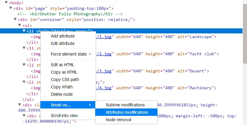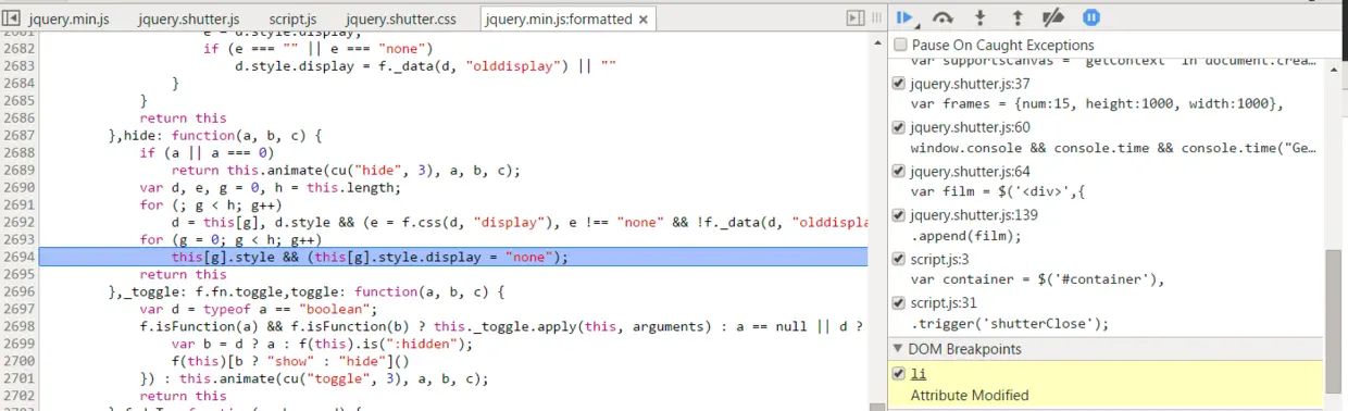 然后回到Chrome里继续操作,Chrome开发者工具的调试器就会自动在DOM的属性发生变化的地方停下来: