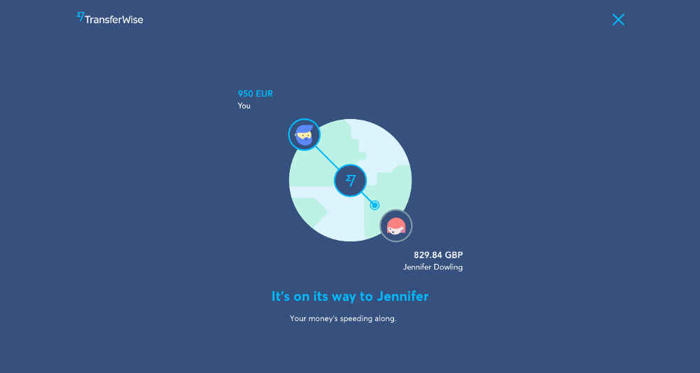 动画设计用来指导用户完成转账中的每一步操作。例如,当从欧洲向英国转账时,用户会看到: - 他们的钱到达了 TransferWise 的欧洲账户 - TransferWise 检查他们转账有没有为,例如检查有没有欺诈 - 他们的钱从 TransferWise 的英国账户转到他们的收款人手中
