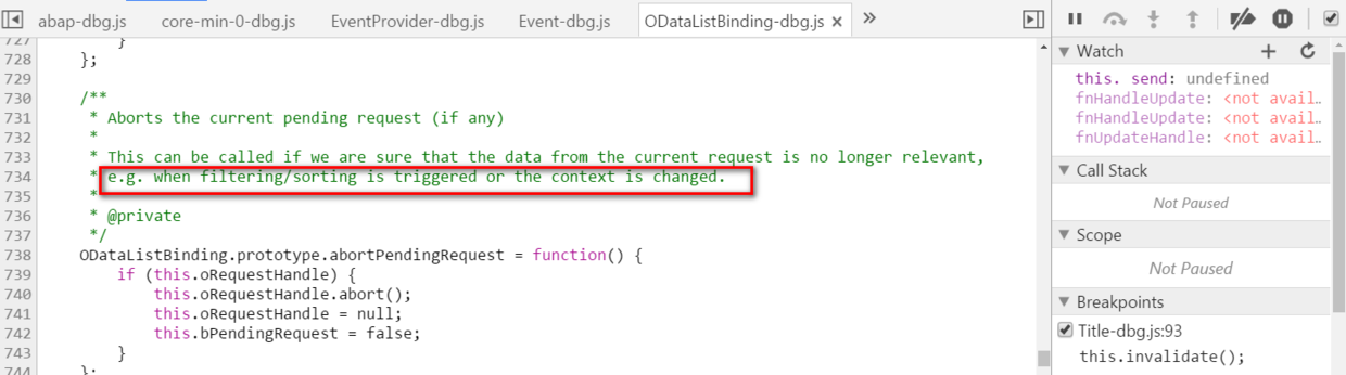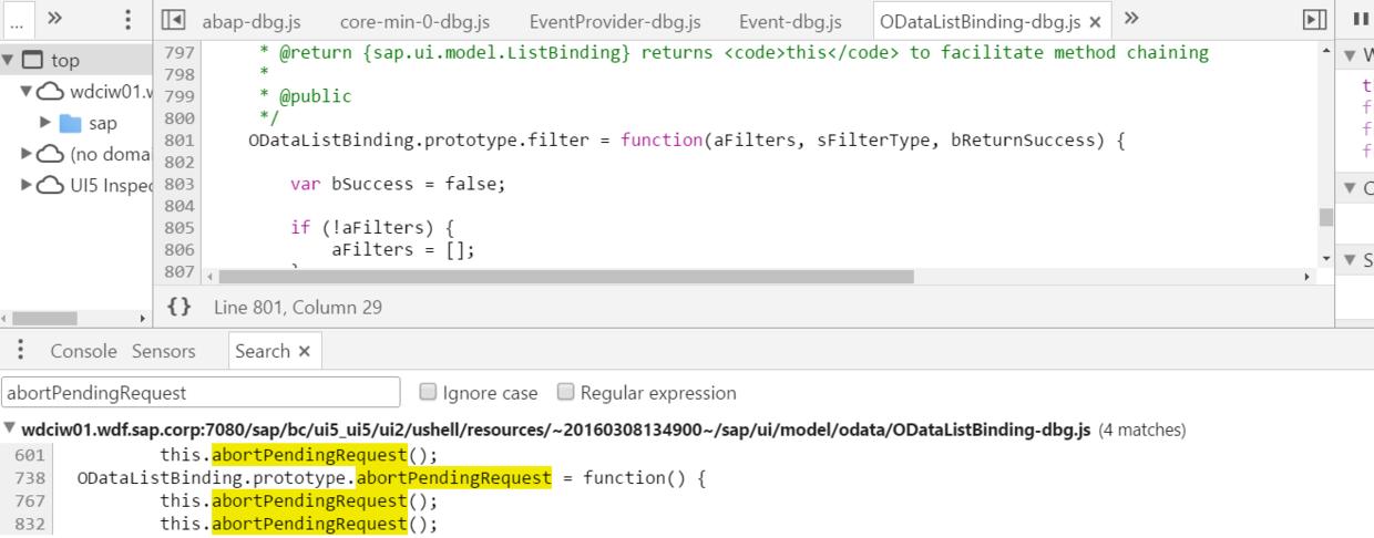 什么情况下会导致AbortPendingRequest? 直接使用Chrome开发者工具的全文搜索得到答案:OData model的三个API: filter, sort, refresh