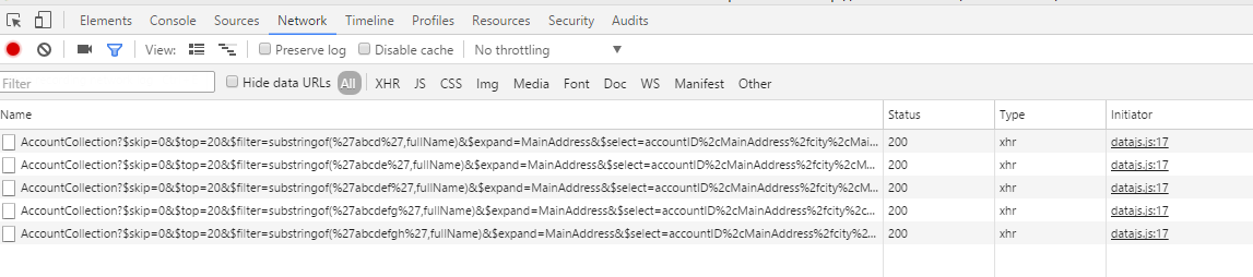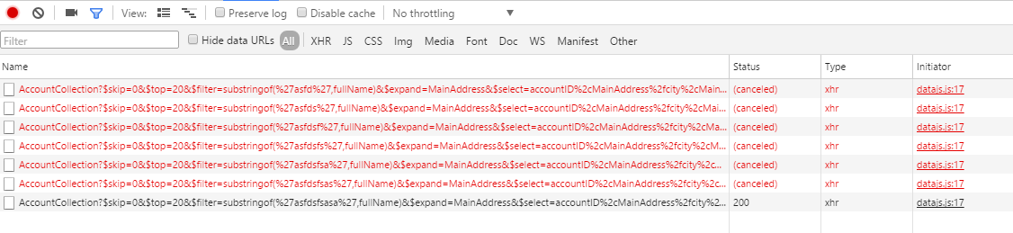 在我们的live search功能上,如果输入较快或者正常速度输入,会看到前面很多输入请求都会被cancel掉: