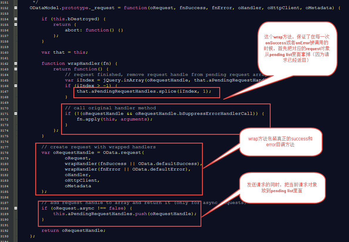每次发起OData请求的时候都会调用ODataModel的_request()方法,这个方法会把当前的request加到pending list中,并且通过一个wrap method包装回调函数,确保在响应返回的时候首先把缓存的request对象从pending list中拿掉: