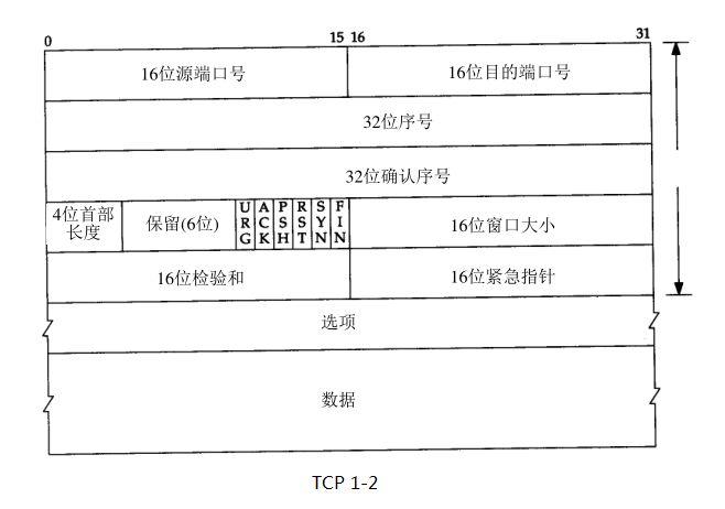 TCP首部(如图TCP1-2所示),如果不计任选字段通常是20个字节。每个TCP段都包含源端和目的端的端口号,用于寻找发端和收端应用进程。这两个值加上IP首部中的源端IP地址和目的端IP地址唯一确定一个TCP连接。32位序号用来标识从TCP发送端向TCP接收端发送的数据字节流,它表示在这个报文段中的的第一个数据字节。在TCP首部中有6个标志比特:URG(紧急指针有效) ACK(确认序号有效) PSH(接收方应该尽快将这个报文段交给应用层) RST(重建连接) SYN(同步序号用来发起一个连接) FIN(发端完成发送任务)。