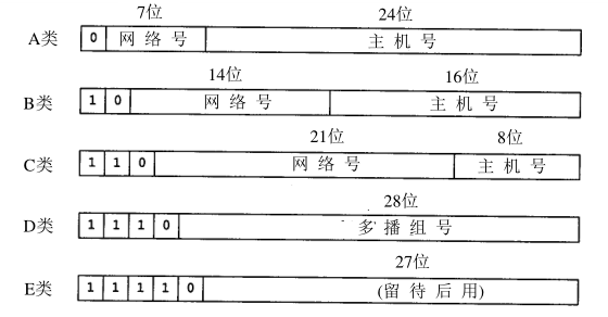 互联网上的每个接口必须有一个唯一的Internet地址(也称作IP地址)。IP地址长32 bit。Internet地址并不采用平面形式的地址空间,如1、2、3等。IP地址具有一定的结构,五类不同的互联网地址格式如下图所示。