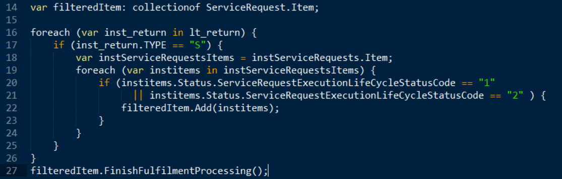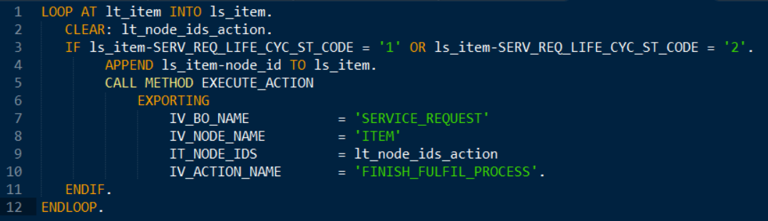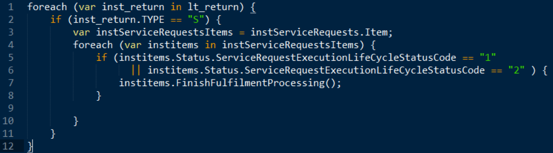 第一行和第四行有两个循环,然后在第二次循环里调用一个比较耗时的ServiceRequest BO的item 节点上定义的标准action FinishFulfilmentProcessing。代码的时间复杂度为o(n2)