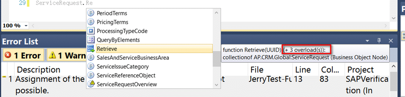 当我们在Cloud Studio里通过代码自动完成功能试图调用BO的Retrieve方法时,IDE会提示我们Retrieve方法有三个重载(Overload), 这表明Retrieve能够支持传入不同的参数。