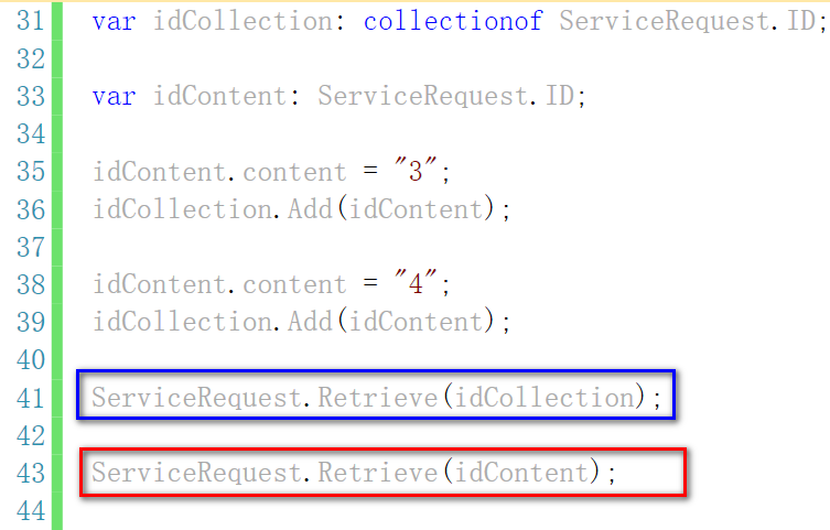 正确和不建议的做法分别见下图蓝色和红色代码。可以看到蓝色代码retrieve接受的输入参数是一个集合, 包含了两个ID为3和4的元素,使得41行的调用能够一次即可返回2个ServiceRequest的数据。