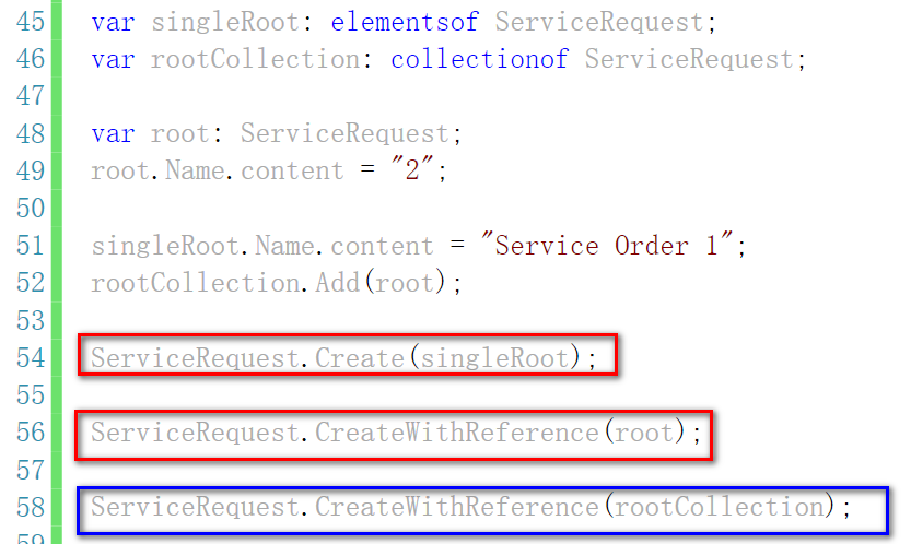但是对于CreateWithReference的场景,则和第二个例子的Retrieve场景一样,不仅支持传入单个数据(第56行), 也支持传入一个集合(第58行)。