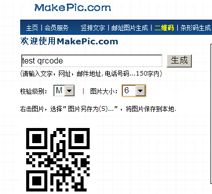 在网页上输入要生成的二维码数据源,校验级别和图片大小,点生成即可看到生成的二维码图片: