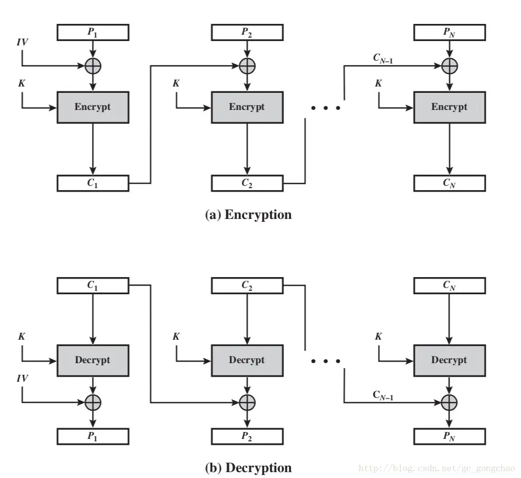 我们可以明显地看到CBC模式的原理图要比ECB模式的复杂一点,而且相关“公式“也不一样,关键之处在于算法输入之前多了一步异或处理。加密时明文分组要与前一个分组的密文进行异或,然后再进行本分组的加密,解密时将解密算法的输出结果与前一个密文分组异或得到该分组的明文。很明显该工作模式不能并发的加密与解密,因为当前组依赖于前一分组。