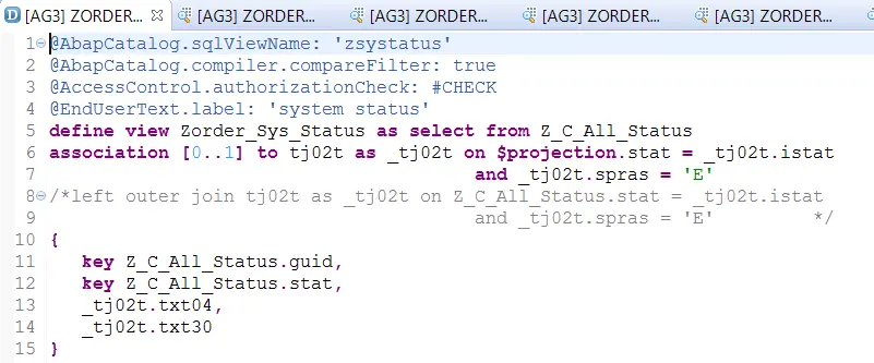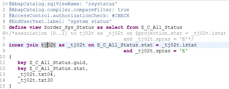 测试用的CDS视图的源代码,第8行用Inner Join连接TJ02T, 后者存放了所有系统状态的ID和描述。