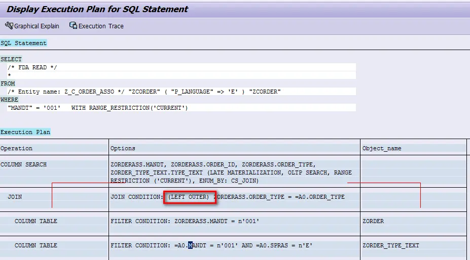 事务码ST05里的这个按钮: 显示执行计划,也能显示出association底层是由Left Outer Join实现的。