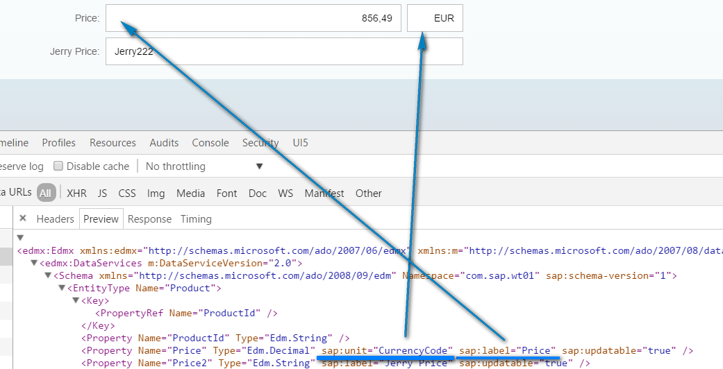 在runtime时,它会自动被渲染成带单位的currency field。后面那个EUR的currency field就像变戏法一样生成了,其实就是sap:unit="CurrencyCode"这个annotation起的作用。至于框架是如何解析annotation并自动生成currency field,相关的代码和分析都在上述提到的博客Currency example – how Smart field works里。