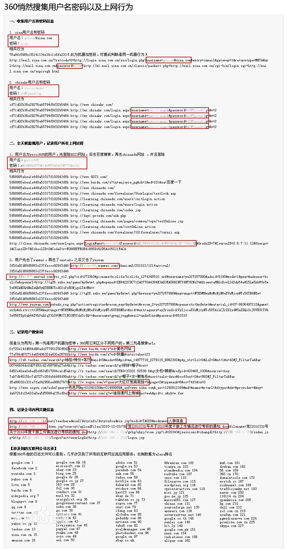 经过 360 对网址云安全查询日志的统计,发现带有用户名和密码的数据的确保存在了 360 的服务器上。通过访问 Google 的确可以访问到这部分数据。GOOGLE 已经将这些数据删除。 但是,由于该服务器可在互联网上直接访问,因而可能所有被上传的用户数据都已经被各类黑客、电脑爱好者、潜在的破坏者下载。因此,实际造成了不可估量的损失。使用 360 软件的用户应当及时更换密码。