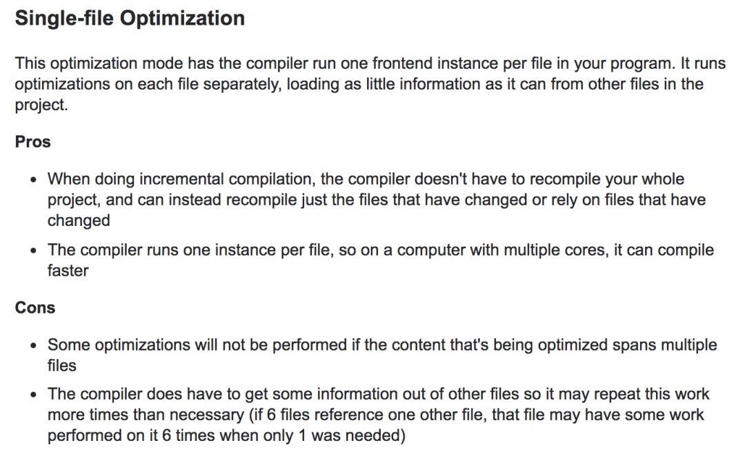 Single File 是逐个文件进行优化,它的好处是对于增量编译的项目来说,它可以减少编译时间,对没有更改的源文件,不用每次都重新编译。并且可以充分利用多核 CPU,并行优化多个文件,提高编译速度。