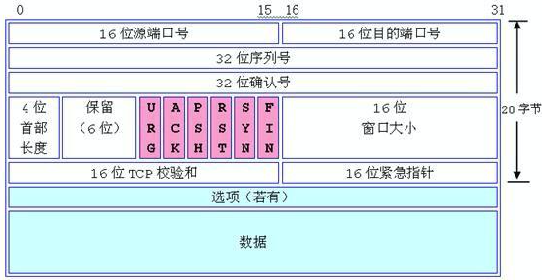 首部长度:TCP 首部的长度,单位为 4 字节。如果没有可选字段,那么这里的值就是 5。表示 TCP 首部的长度为 20 字节