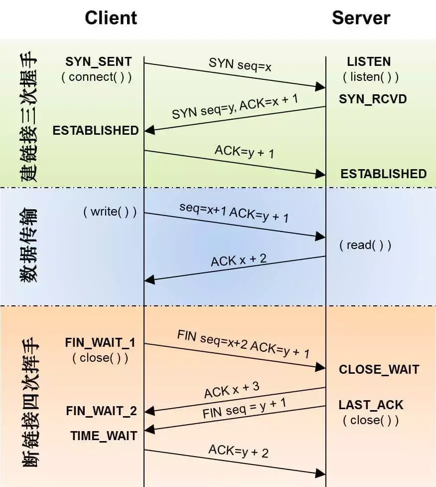 - 第三次握手,客户端接收以后,说明服务端接收成功,然后再返回 ack = y+1,表示客户端已经接收成功可以开始连接