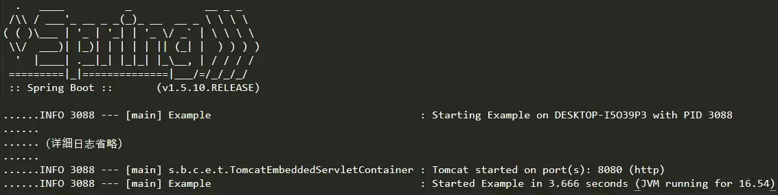 6.直接执行Example类中的main方法启动应用,应用启动时会使用内嵌的Tomcat服务器,同时使用默认8080端口对外提供服务。成功启动后会输出如下图的日志信息。