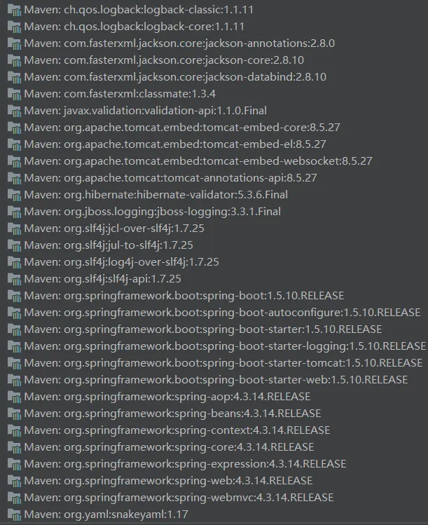 首先是pom.xml中的配置,继承spring-boot-starter-parent是快速使用Spring Boot的一种方式,也可以选择不继承。Spring Boot中的Starter是一个包含很多依赖描述的集合,只要添加一个Starter,这个Starter里面约定的依赖都会被添加到项目中,例如示例代码添加了spring-boot-starter-web,执行maven操作会下载web应用需要的依赖jar,如下图。
