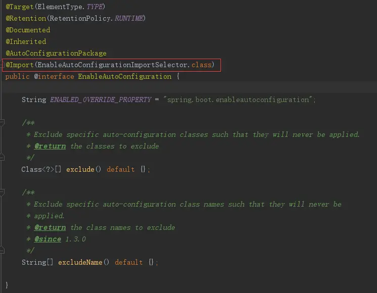 这个注解有两个属性,exclude用于标记哪些类不需要被自动配置,excludeName也用于标记哪些类不需要被自动配置,只不过它存的是类的名称。
