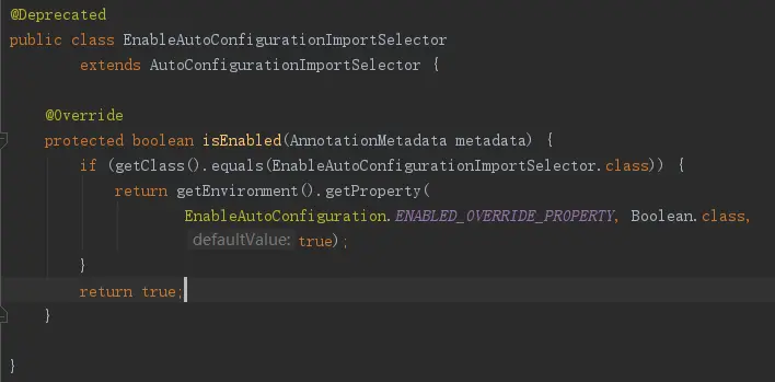 从上图的红框中可以看到在@EnableAutoConfiguration注解的定义中使用了@Import注解,@Import注解是在Spring3.0添加的,使用@Import导入EnableAutoConfigurationImportSelector.class,作用等同于在Spring的xml文件中使用<import/>导入,查看EnableAutoConfigurationImportSelector源码你会发现它就是用于处理@EnableAutoConfiguration注解的,不过在Spring Boot1.5版本开始被标记为弃用,可以使用AutoConfigurationImportSelector代替,也就是它的父类。