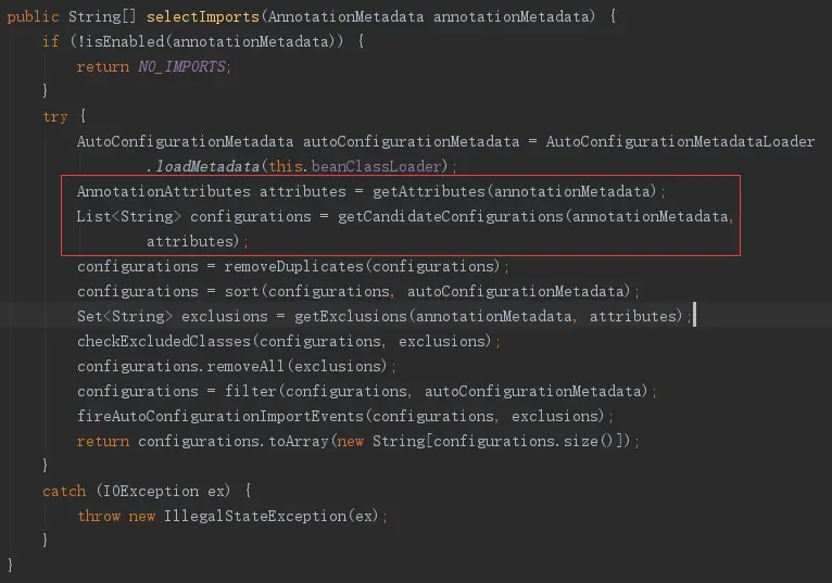执行AnnotationAttributes attributes = getAttributes(annotationMetadata)可以获取@EnableAutoConfiguration注解中exclude和excludeName属性值,然后把值封装在AnnotationAttributes中。