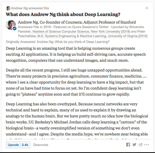 Deep Learning has also been overhyped. Because neural networks are very technical and hard to explain, many of us used to explain it by drawing an analogy to the human brain. But we have pretty much no idea how the biological brain works. UC Berkeley's Michael Jordan calls deep learning a "cartoon" of the biological brain--a vastly oversimplified version of something we don't even understand--and I agree. Despite the media hype, we're nowhere near being able to build human-level intelligence. Because we fundamentally don't know how the brain works, attempts to blindly replicate what little we know in a computer also has not resulted in particularly useful AI systems. Instead, the most effective deep learning work today has made its progress by drawing from CS and engineering principles and at most a touch of biological inspiration, rather than try to blindly copy biology.