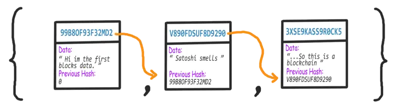 一个区块链只是一个个区块的链接/列表。区块链中的每一个区块都会有自己的数字签名,前一个区块的数字签名和一些数据(例如一些交易数据)。