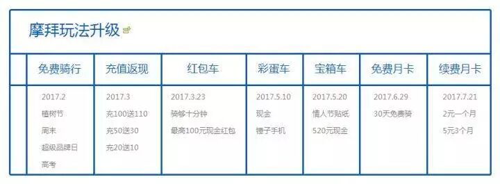 优化了获客和激活,该提升留存和活跃了。竞争对手很多很强,我们首要的目标是市场份额。Uber上海GM出身的王晓峰对垒前Uber北西区RGM张严琪,Uber总部海归的杨毓杰对阵Uber总部海归的陈为,摩拜和ofo双方都不缺有经验的老兵。2017年我们都见识到了老兵怎么打补贴大战:训练有素、招招到肉、烧钱不眨眼。这段爆发期,我们总结起来一共做了这些事情: