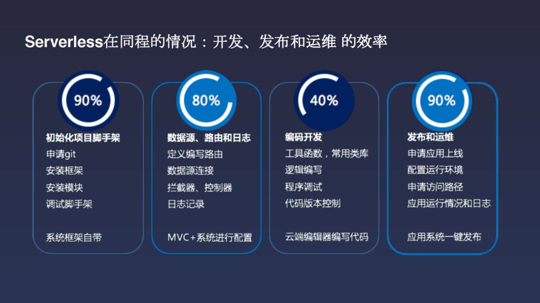 我们发现做了这样的一个事情以后,对于我们开发的初期,任何一个项目,任何一个独立部署的功能开始放置时,一定会要申请一系列的东西,在这些事情上我们省了90%的时间。再接下来是找数据,DB在哪看起来是小事,但其实在开发看来是很烦的,测试环境的DB在哪,开发环境的DB在哪,预发环境的DB在哪,搞错一个就完了。所以做了Serverless之后,在这些事情上省了80%的时间。对于写代码来说,其实节省的时间不多,毕竟很多代码还是要人写的。在这个环节我们提供的很多SDK起了不少作用,节省了40%的时间。还有90%的时间是运维这边省下来的,当应用作为一个小脚本来部署的话,整个平台化,连开发工具都没有了,那么这样对于运维来说更简单,一个监控系统就可以全自动化地做掉。