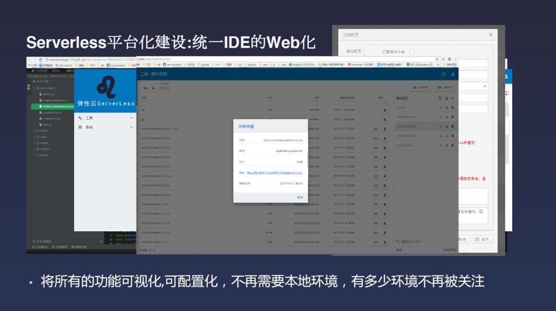 做了这么多事情以后,其实我们发现还不够Serverless。我刚才说了还有个很大的问题,本地是好的,但线上或测试环境不行,这个问题还是没有解决。这就还是在关注环境,还是不能够仅关注代码。所以我们做了一个Web IDE,开发同学不用再关心本地的开发环境,也不再需要配置本地开发环境的依赖关系。因为当微服务化以后,特别是大量大团队去合作的时候,往往它的互相依赖关系在本地很难模拟出来。我们提供Web IDE,让每个同学打开一个Web网页就能写代码,这样代码在写的时候,一切就在我的控制之下。