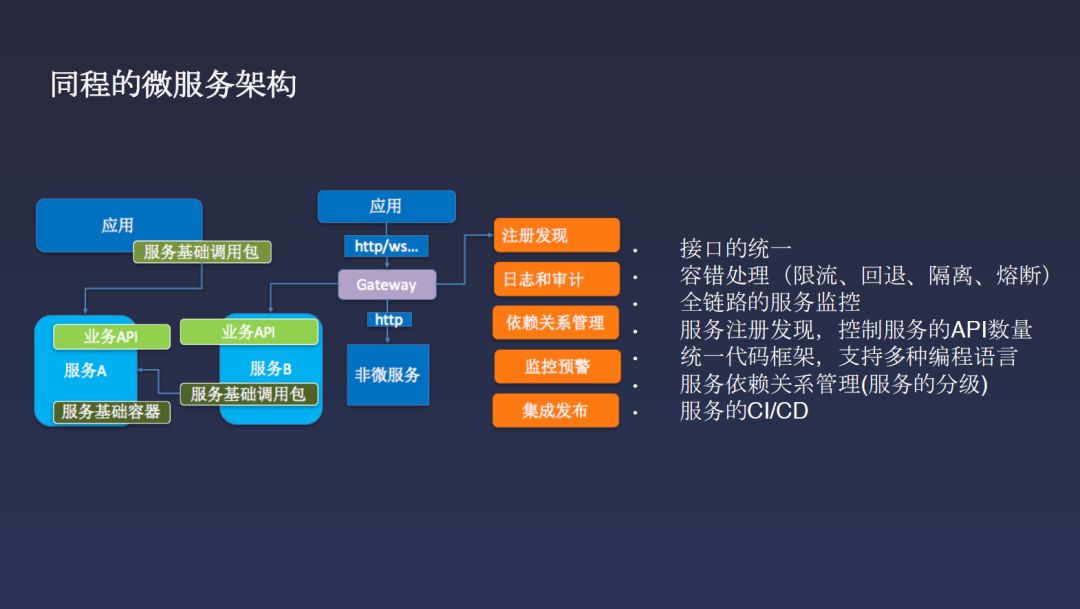 还有一个困难就是依赖关系,这也是开发过程当中非常头疼的问题。我自己是个Java程序员,有时候自己写个一两千行代码,只有一两个文件,打一个包,60几兆出来了,一堆依赖关系。当然现在用Go好一些了,但这样的问题能不能解决?比如说同程很多的同学,我们在苏州,北京也有一些开发,在苏州我们有近千名程序员。当有这么多程序员的时候,如何让这些程序员的效率更好地提升?当然你可以用管理,用开发模式去做。但是用技术去解决依赖关系,让没有依赖关系产生不是更好?即使有依赖,也是用接口的形式去调,这样就舒服多了。