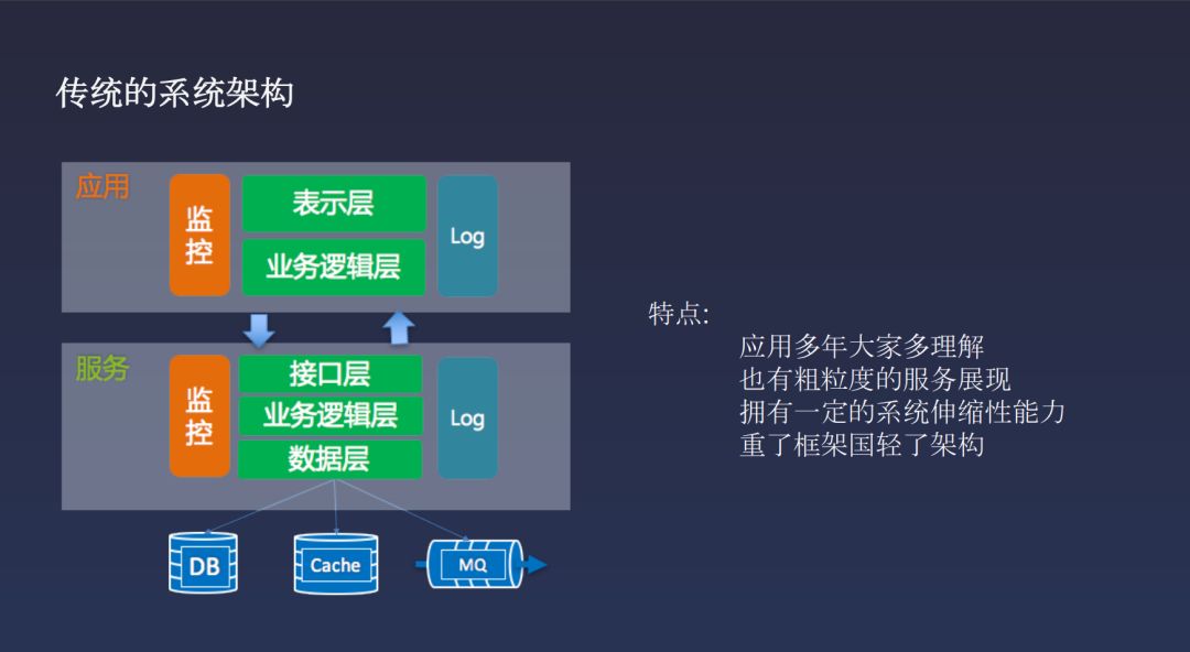 这是同程最老的一个架构,这个架构基本上是同程创业的时候那几个老板自己写的。10年前看这个系统的时候感觉还可以,做这样的架构没有问题。但如果是17年的时候还用这样的架构,大家会觉得OTA的技术果然比较弱,还在用这样的系统。但其实今天在同程的系统里确实还有这样的架构出现,而且还有新做的系统也长这个样。为什么有这样的问题呢?比如说我们某个业务同学发现在澳大利亚的某个沙漠深处很好玩,产品经理感觉也不错,要成立个项目干这个事。然后就给他三程序员,你让他们写个微服务的系统出来,不可能。能写个上面这样的架构就不错了,说不定连服务都没有,直接都堆到应用里了。这样的业务在整个旅游场景里面非常多,我们把它叫做打样业务或者创新业务。一个事业部会孵化这样的项目N多个,可能一个成了,就会慢慢发展成大项目的。