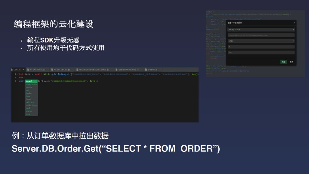 但这里又产生一个问题,就这样的话程序员编程快乐了吗?我想还是不快乐的。我比较讨厌的是想写行代码从数据库里面取一个数据,结果需要我找什么驱动,问我DB地址、密码,以及打各种各样的类库,烦都烦死了。所以我们也开始做了个SDK,让代码能更好地去用它。如下图所示的从数据库拉数据的例子,当你编程时不需要关心服务器在哪儿,专注于代码就可以了。这样一个Server.DB的库在整个平台会有一个配置中心进行管理,所有DB可以人工地配进去,配进去之后它就生成了这个对象,对于开发同学来说他只需要敲就行了。