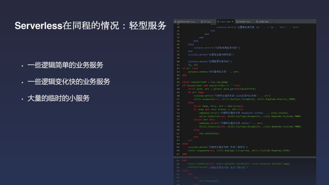 这是我们Serverless架构的资源利用图。基本是在物理机的基础上去布Docker容器,Docker容器里再去开我们一个个实例去部署出来,然后做个隔离。我们做了实验,最小的部署量能在4台物理机上部署10万个应用。当然,这在生产环境是做不到的,10万个脚本服务在生产环境都有流量的话,光这些流量就把它打死了。使用这样的Serverless之后,很多轻的应用是可以随时下线的,就解决了那些流量很少但是必须活着的服务的问题。