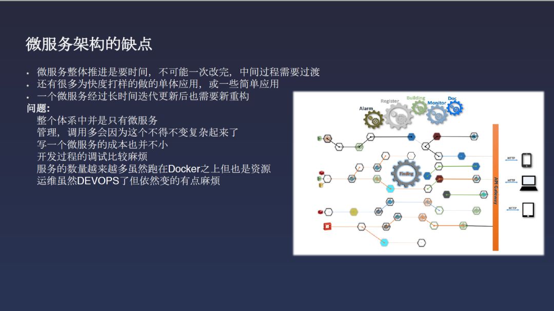 微服务产生的结果,就是这个服务不停长大。原来我们微服务的目的是业务单一化,做得更小更好更稳定,独立地部署,可以去做编排。但当你三五个月或一年半以后再去看时,会发现这玩意就是个吃胖的杨贵妃,不再是那个窈窕淑女。编排也排不起来了,因为里面包含了太多的东西。那这就是同程在做微服务时遇到的麻烦。我们的解决方案是再做个Gateway,把长胖的胖子关进去,对外还是用多个微服务基本接口,只是有不同的路由策略去选择使用哪个版本的接口。这做完之后,其实带来的是维护成本和维护代价非常大。