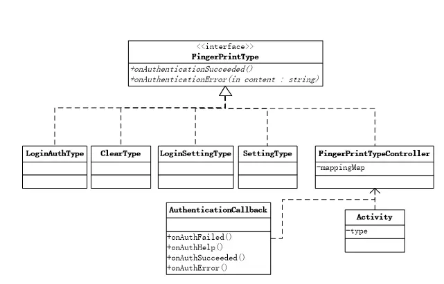 那控制器 FingerPrintTypeController 和四个场景的关系又是如何?我们看看类图。