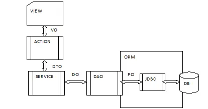 项目中我们并没有严格遵循这种传递关系,但这种和业务层次的关联对我们理解各实体类的作用是有帮助的。(我们没有接触到PO的原因,我理解为ORM对PO进行了封装)