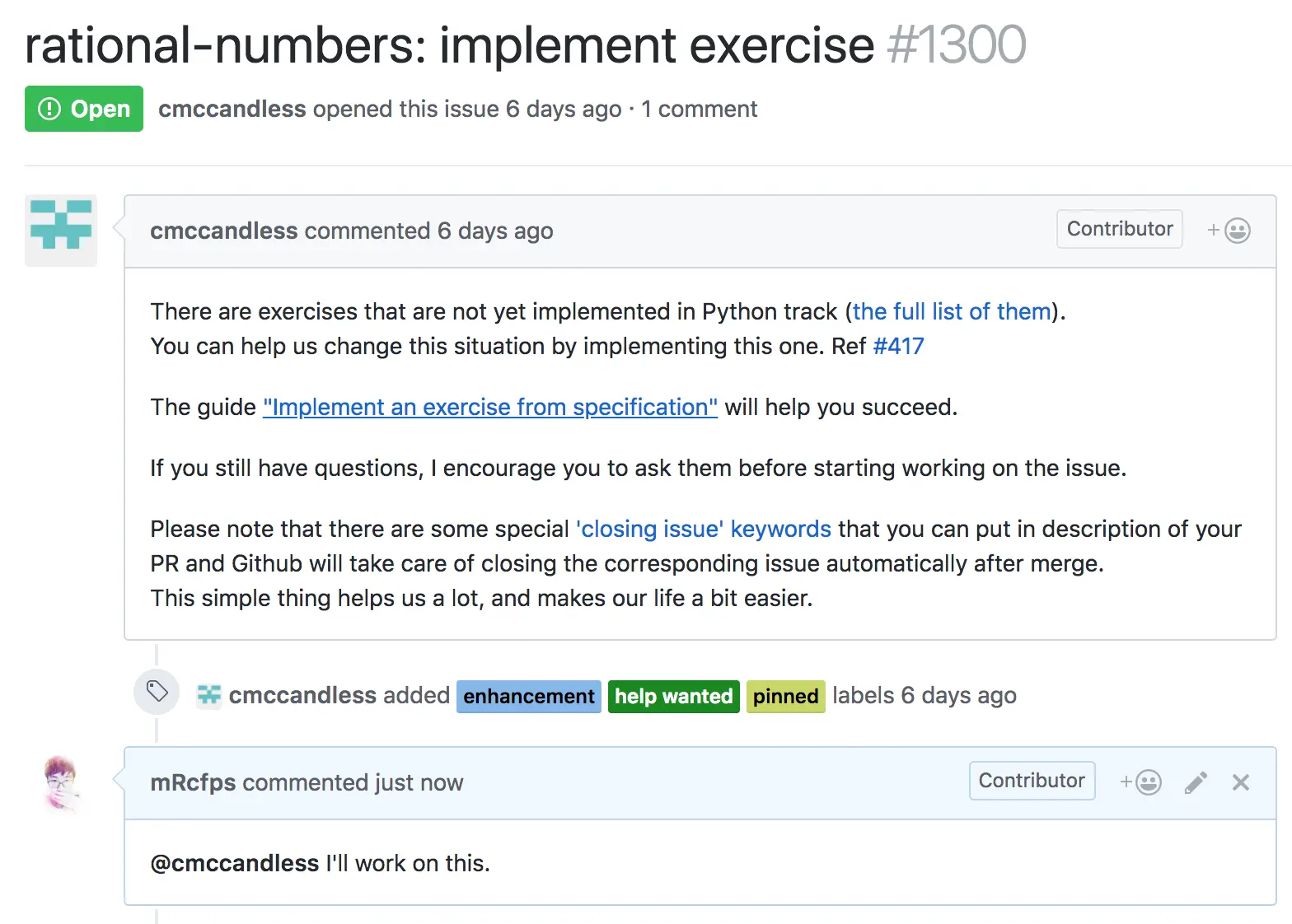 这里我们选择解决 rational-numbers: implement exercise,任务就是实现一个新的练习,名为 rational-numbers。之所以选择这个 Issue,是因为仓库维护者很认真地把实现新练习的详细步骤都告诉了我们,而且也没有其他人领这个任务。于是我们回复一句“I'll work on this”,既是通知维护者,也是告诉其他人我们已经负责解决这个 Issue,请不要重复劳动。