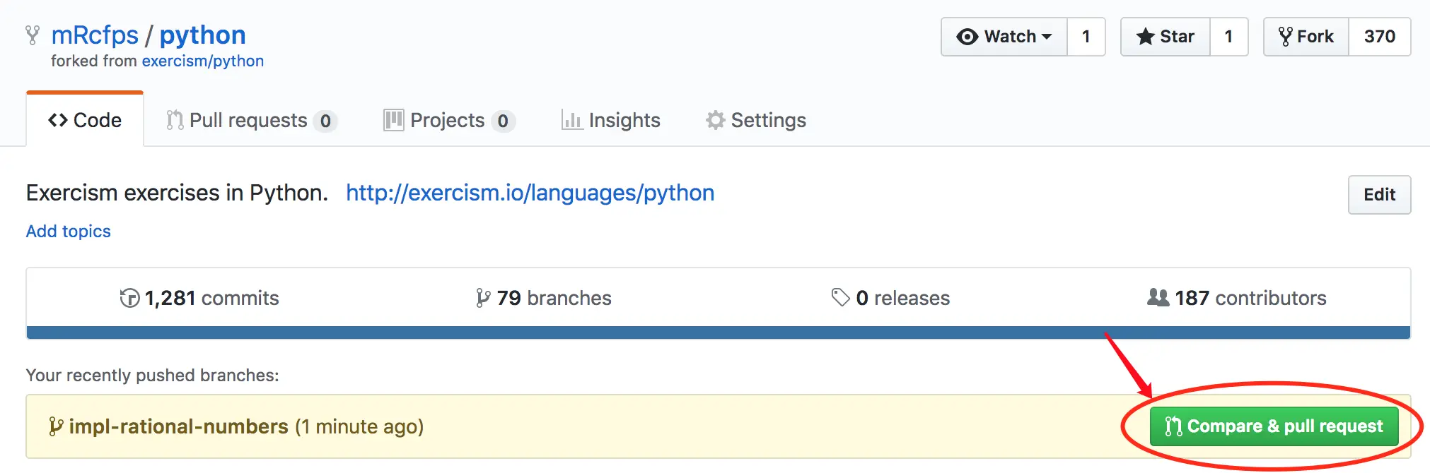 实际上如果你打开 exercism/python 的页面也会出现这样的提示。然后点击按钮 Compare & pull request,开始编辑我们的 PR: