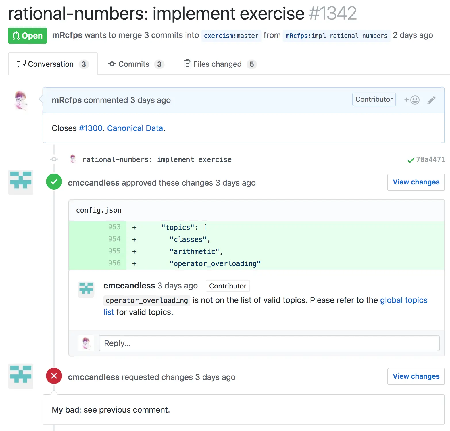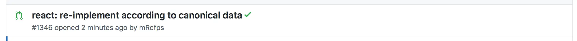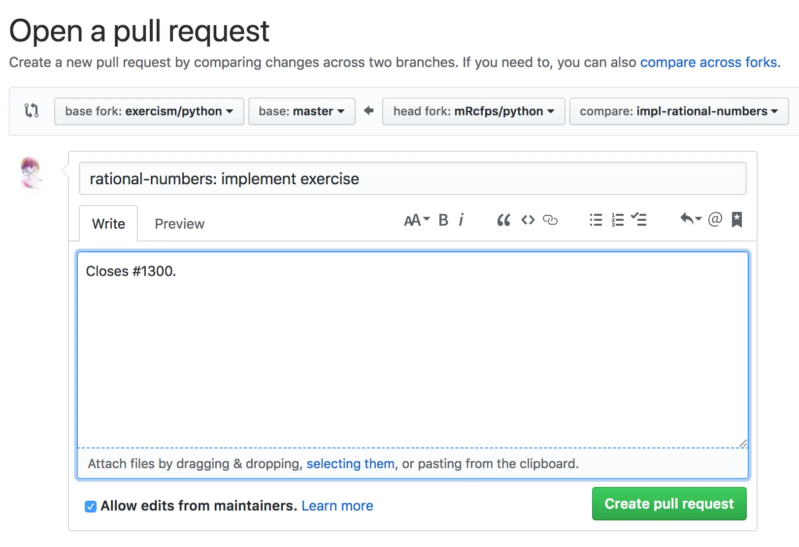 这里要说明一下 GitHub 关键词:当使用 fix(es),close(s) 或 resolve(s) 时,如果这个 Pull Request 被合并,会自动关闭对应的 Issue。这里我标出了 Closes #1300,那么当我们贡献的代码被接受时,就会关闭 rational-numbers: implement exercise 这个 Issue。正确地使用 GitHub 关键词能够极大地方便仓库维护者,他们就不需要去查找对应的是哪个 Issue 并去手动关闭它了。